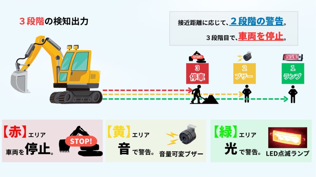 2. 黄エリア(中距離): ブザー鳴動で危険を明確に通知