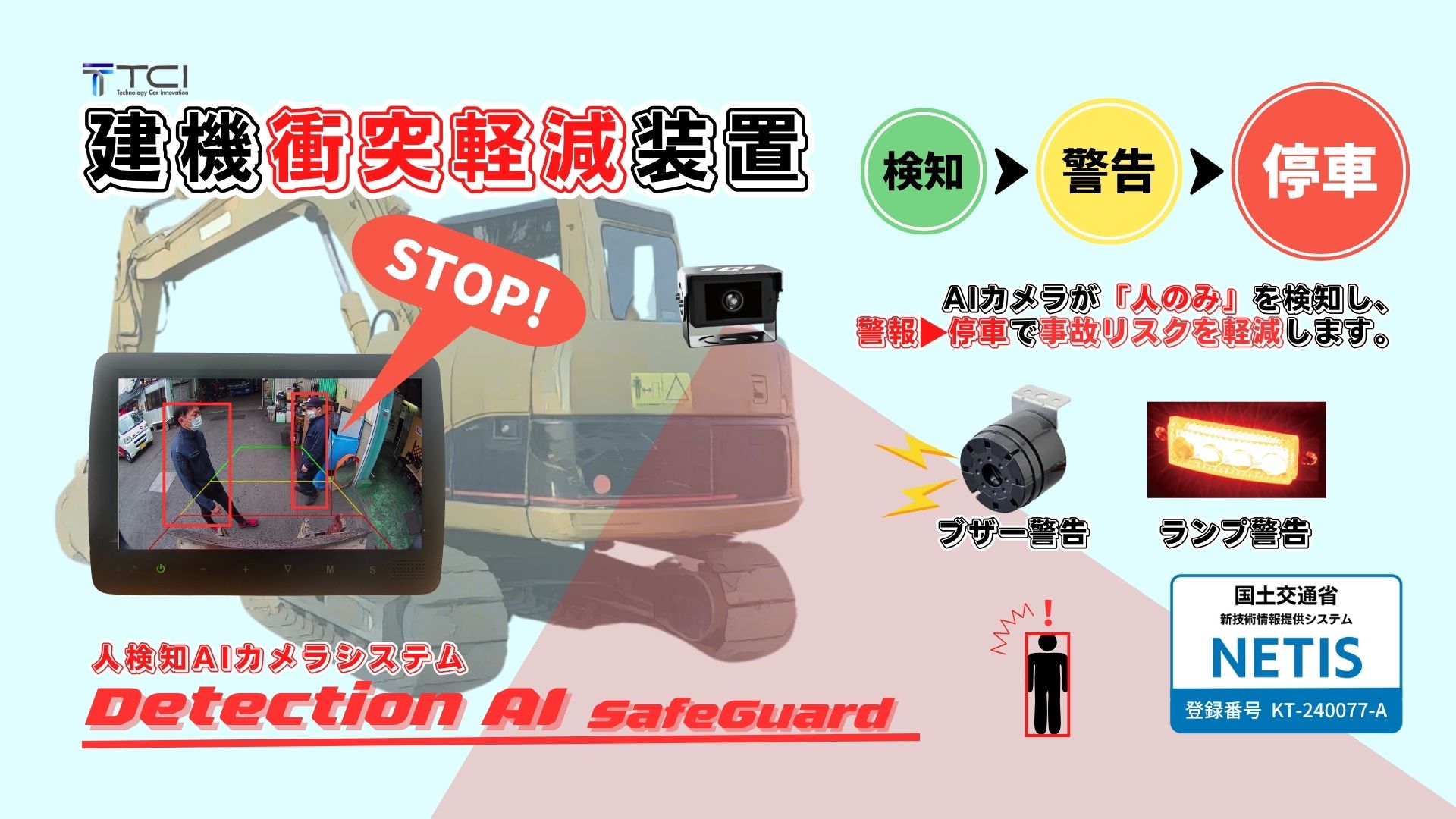 重機と作業員の接触事故を防ぐ効果的なソリューションとして開発されたのが、AIカメラによる人検知・衝突軽減システム「Detection AI SafeGuard」です。
