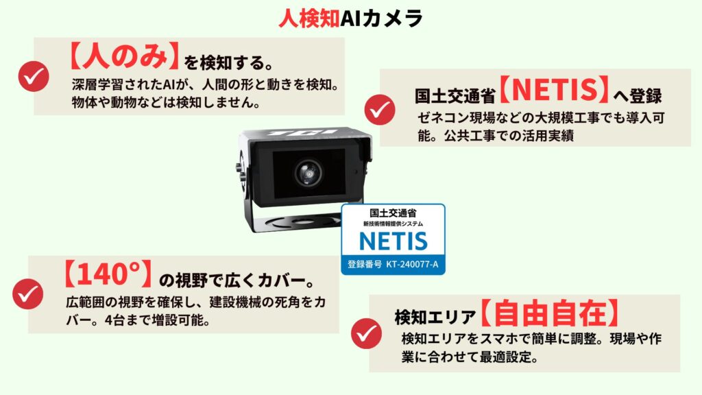 TCI製品の人検知AIカメラ「Detection AI」は、こうした人間の限界を補完し、重機作業における死角をなくす革新的なソリューションです。